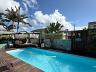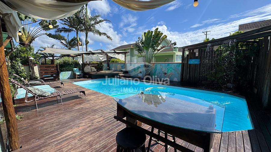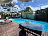 - Área de lazer com deck, piscina, banheira